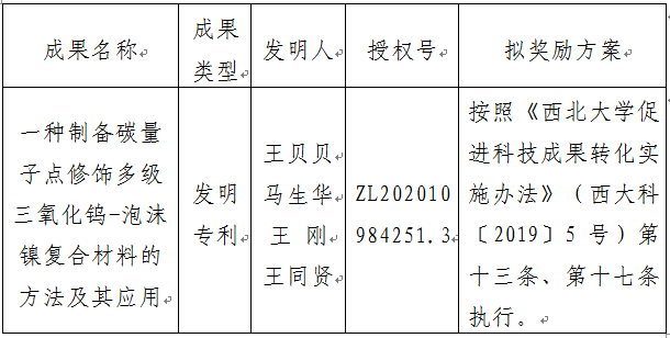 按照《广发体育促进科技成果转化实施办法》(西大科〔2019〕5号)相关规定,拟对广发体育光子所王贝贝老师作为成果负责人的1项发明专利权实施转化,现将相关信息公示如下: