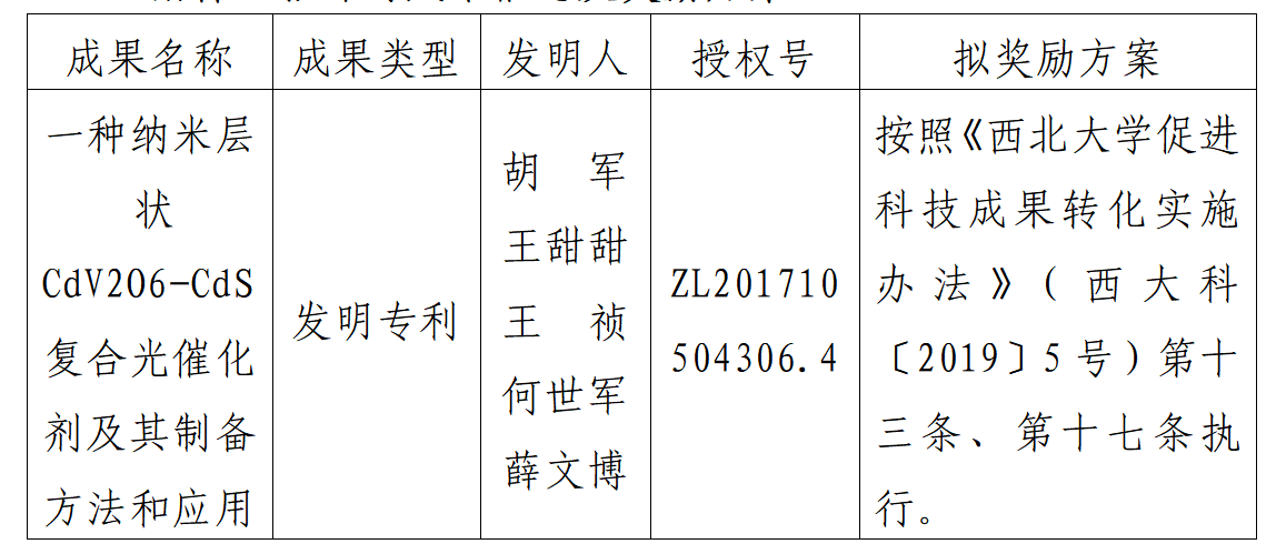 按照《广发体育促进科技成果转化实施办法》(西大科〔2019〕5号)相关规定,拟对广发体育化工学院胡军教授作为成果负责人的1项发明专利权实施转化,现将相关信息公示如下: