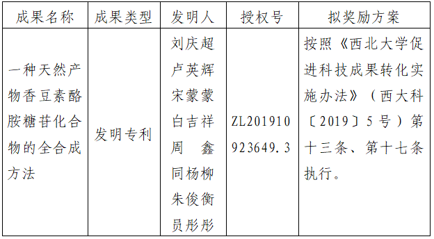 按照《广发体育促进科技成果转化实施办法》(西大科〔2019〕5号)相关规定,拟对广发体育化工学院刘庆超教授作为成果负责人的1项发明专利权实施转化,现将相关信息公示如下: