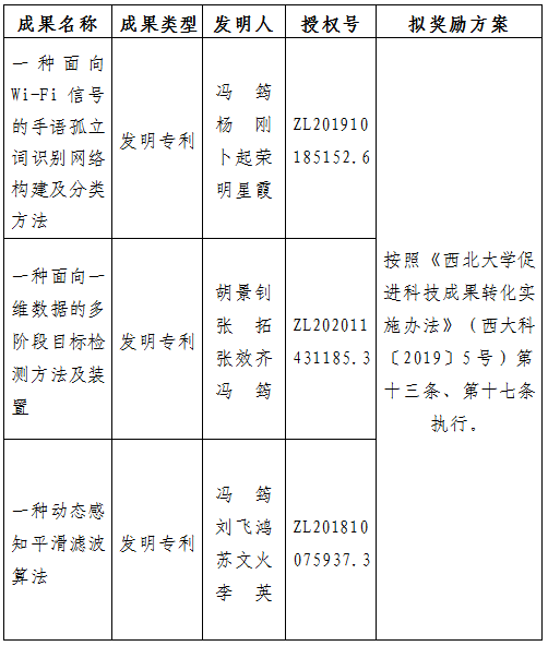 按照《广发体育促进科技成果转化实施办法》(西大科〔2019〕5号)相关规定,拟对广发体育信息科学与技术学院冯筠教授作为成果负责人的3项发明专利权实施转化,现将相关信息公示如下: