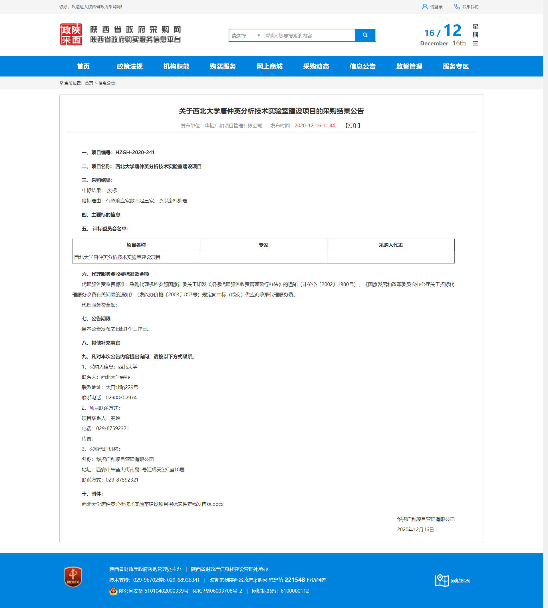 关于广发体育唐仲英分析技术实验室建设项目的采购结果公告 作者: 编辑:薛利娟 时间:2020-12-16 原公告地址:http://www.ccgp-shaanxi.gov.cn/notice/noticeDetail.do?noticeguid=8a85be31765f9a2a017669a24474710e