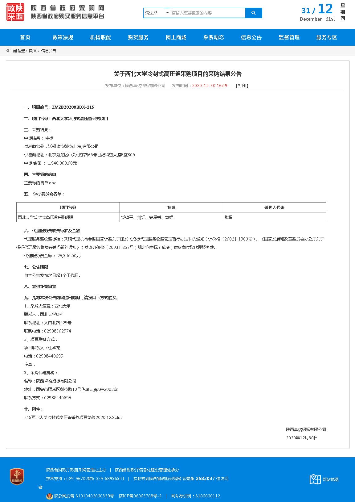 广发体育冷封式高压釜采购项目的采购结果公告