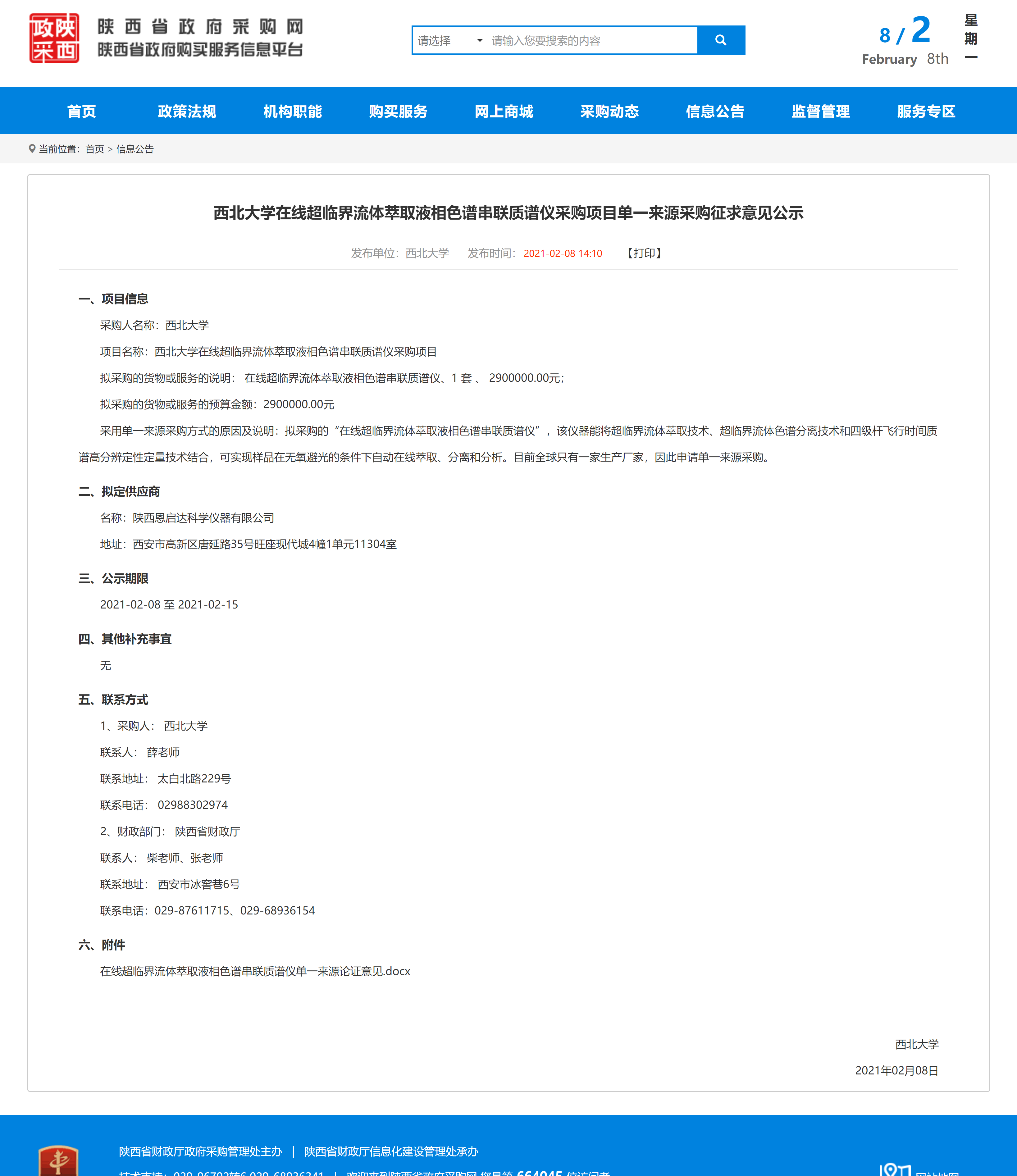 广发体育在线超临界流体萃取液相色谱串联质谱仪采购项目单一来源采购征求意见公示