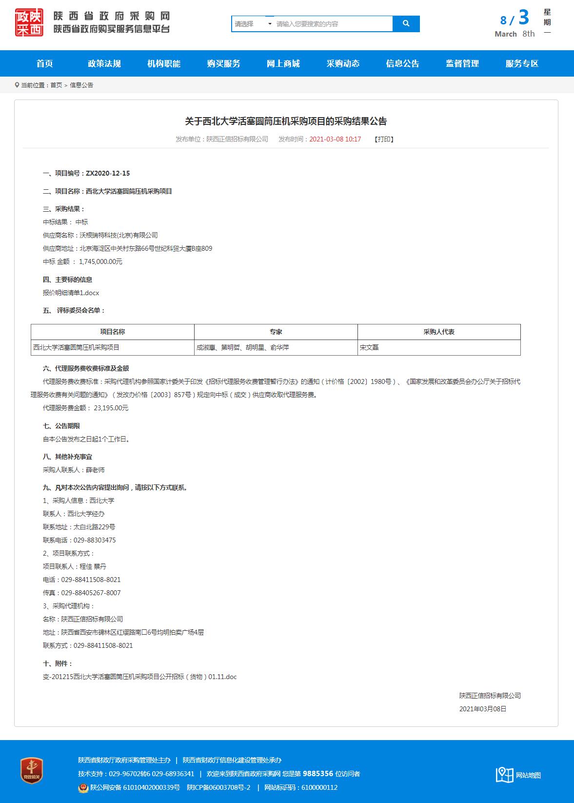 广发体育活塞圆筒压机采购项目的采购结果公告