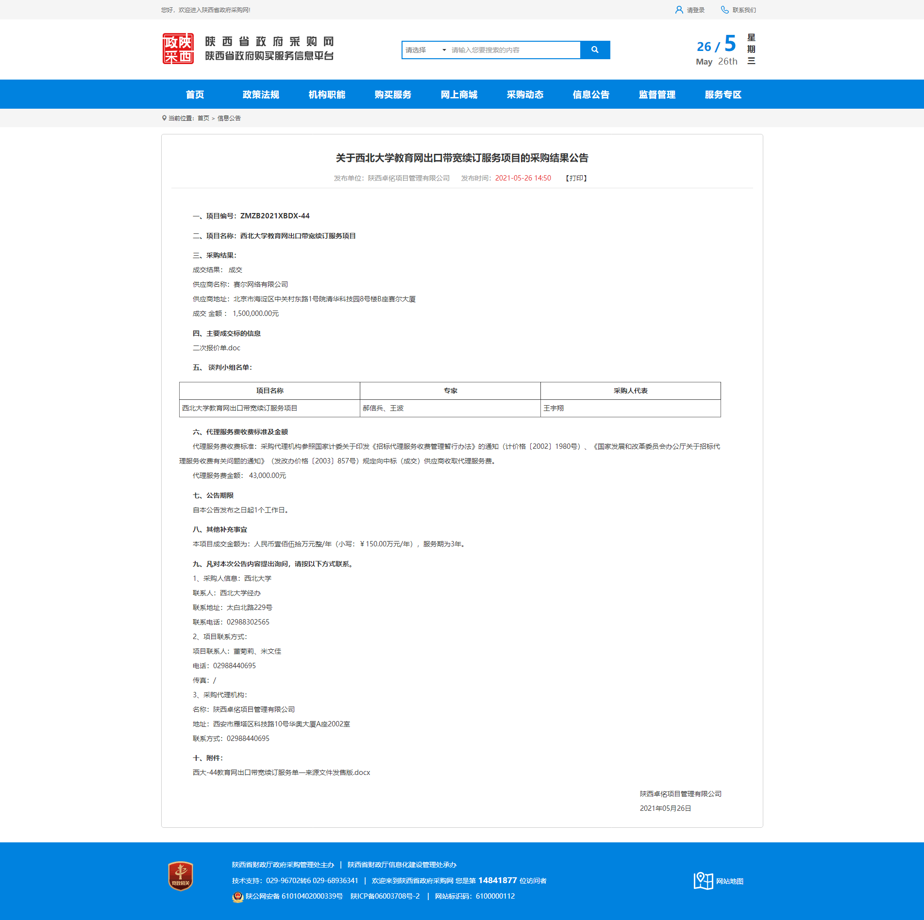 关于广发体育教育网出口带宽续订服务项目的采购结果公告