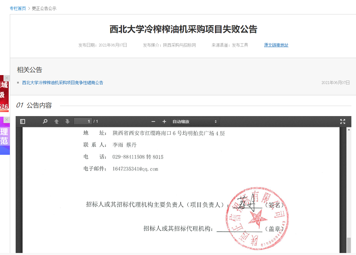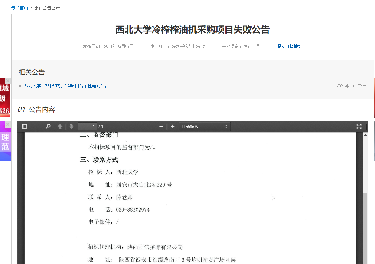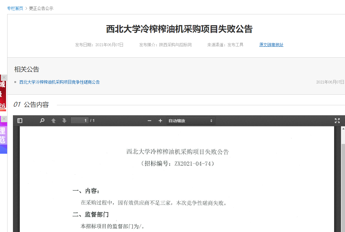 广发体育冷榨榨油机采购项目失败公告 作者: 编辑:薛利娟 时间:2021-06-07 原公告地址:http://bulletin.sntba.com/changeBulletin/2021-06-07/305152.html