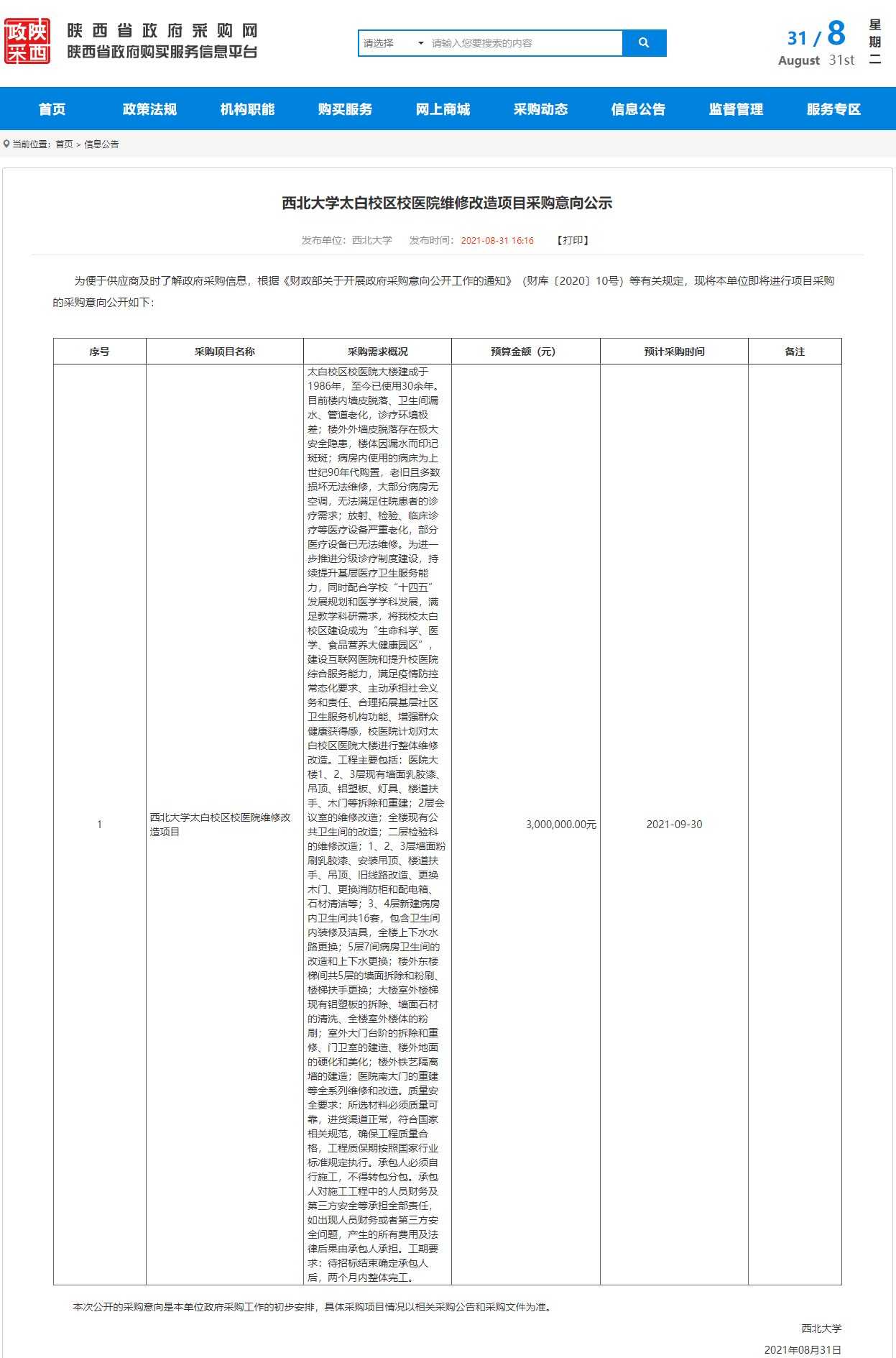 广发体育太白校区校医院维修改造项目采购意向公示