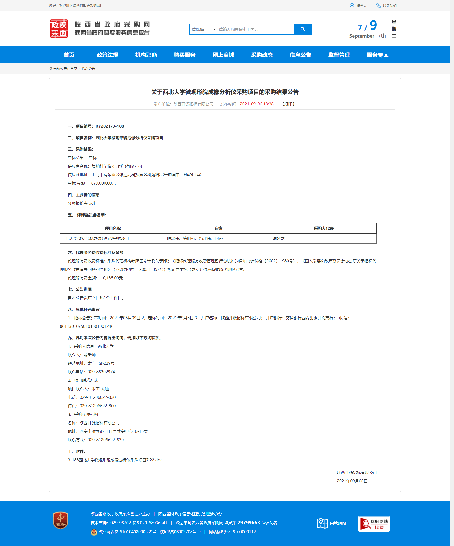 关于广发体育微观形貌成像分析仪采购项目的采购结果公告 作者: 编辑:采购与招标办公室 时间:2021-09-07 原公告地址:http://www.ccgp-shaanxi.gov.cn/notice/noticeDetail.do?noticeguid=8a85be347b04610d017bbaac92114f2e