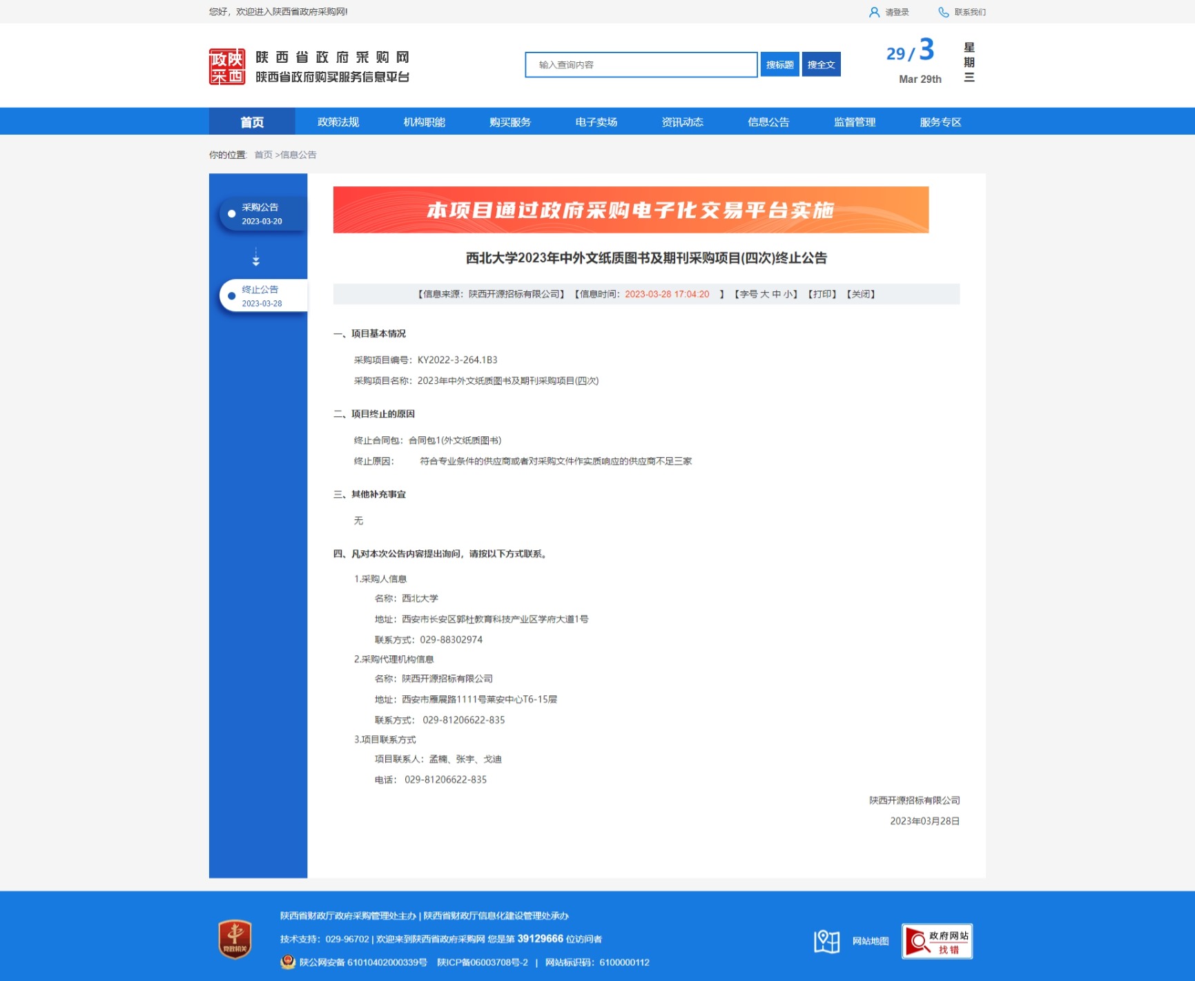 广发体育2023年中外文纸质图书及期刊采购项目(四次)终止公告 作者: 编辑:采购与招标办公室 时间:2023-03-29 原公告链接:http://www.ccgp-shaanxi.gov.cn/freecms/site/shaanxi/ggxx/info/2023/8a69c402865ce80c0187274b628268bb.html?noticeType=001004¬iceId=705c8589-cd48-11ed-9a8e-08c0eb20c666