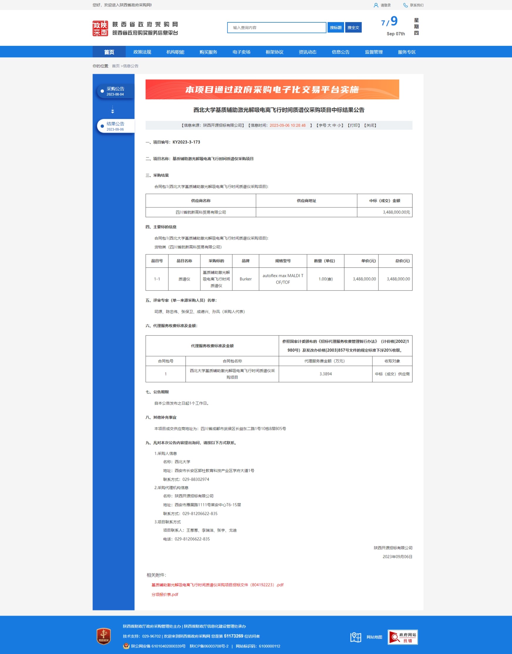 广发体育基质辅助激光解吸电离飞行时间质谱仪采购项目中标结果公告 作者: 编辑:采购与招标办公室 时间:2023-09-07 原公告链接:http://www.ccgp-shaanxi.gov.cn/freecms/site/shaanxi/ggxx/info/2023/8a69c94c8a232697018a6807f05a414a.html?noticeType=001021¬iceId=537f3b8e-4c5e-11ee-9a8e-08c0eb20c666