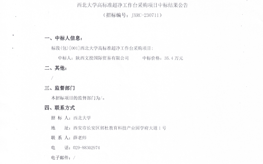 广发体育高标准超净工作台采购项目中标结果公告 作者: 编辑:采购与招标办公室 时间:2023-09-07 原公告链接:http://bulletin.sntba.com/resultBulletin/2023-09-07/651529.html