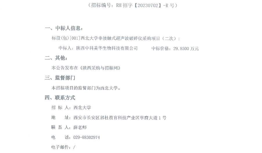 广发体育非接触式超声波破碎仪采购项目(二次)中标结果公告 作者: 编辑:采购与招标办公室 时间:2023-10-10 原公告链接:http://bulletin.sntba.com/resultBulletin/2023-10-09/714535.html