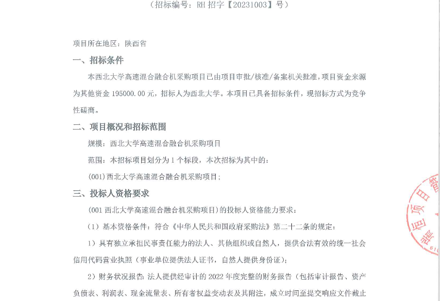 广发体育高速混合融合机采购项目竞争性磋商公告 作者: 编辑:采购与招标办公室 时间:2023-10-18 原公告链接:http://bulletin.sntba.com/biddingBulletin/2023-10-17/735312.html
