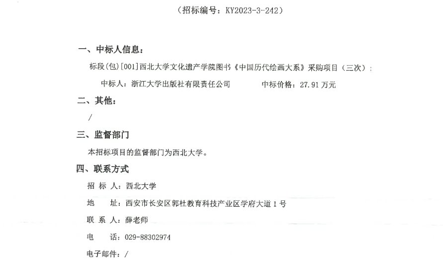 广发体育文化遗产学院图书《中国历代绘画大系》采购项目(三次)成交公告 作者: 编辑:采购与招标办公室 时间:2023-10-25 原公告链接:http://bulletin.sntba.com/resultBulletin/2023-10-24/752147.html