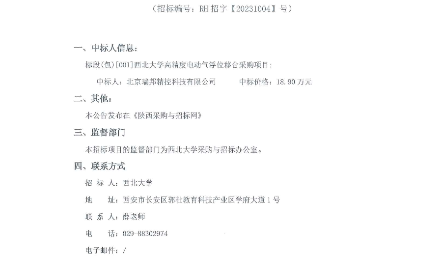 广发体育高精度电动气浮位移台采购项目成交结果公告 作者: 编辑: 时间:2023-10-31 原公告链接:http://bulletin.sntba.com/resultBulletin/2023-10-31/770888.html