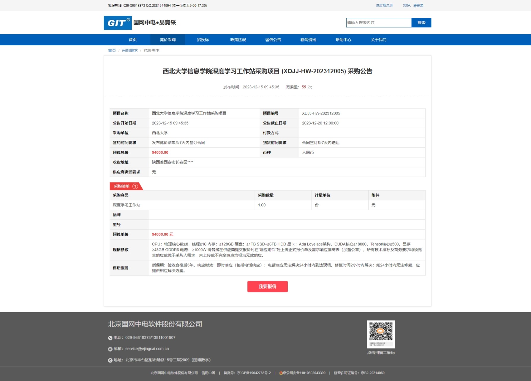 广发体育信息学院深度学习工作站采购项目 (XDJJ-HW-202312005) 采购公告 作者: 编辑:王雯岚 时间:2023-12-19 原公告链接:https://www.ejingcai.com.cn/site/bidding/detail/7837