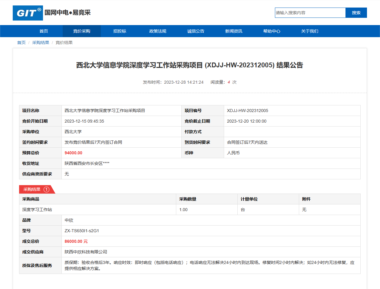 广发体育信息学院深度学习工作站采购项目 (XDJJ-HW-202312005) 竞价结果公告 作者: 编辑:采购与招标办公室 时间:2023-12-28 原公告链接:https://www.ejingcai.com.cn/site/bidding/detail/8075