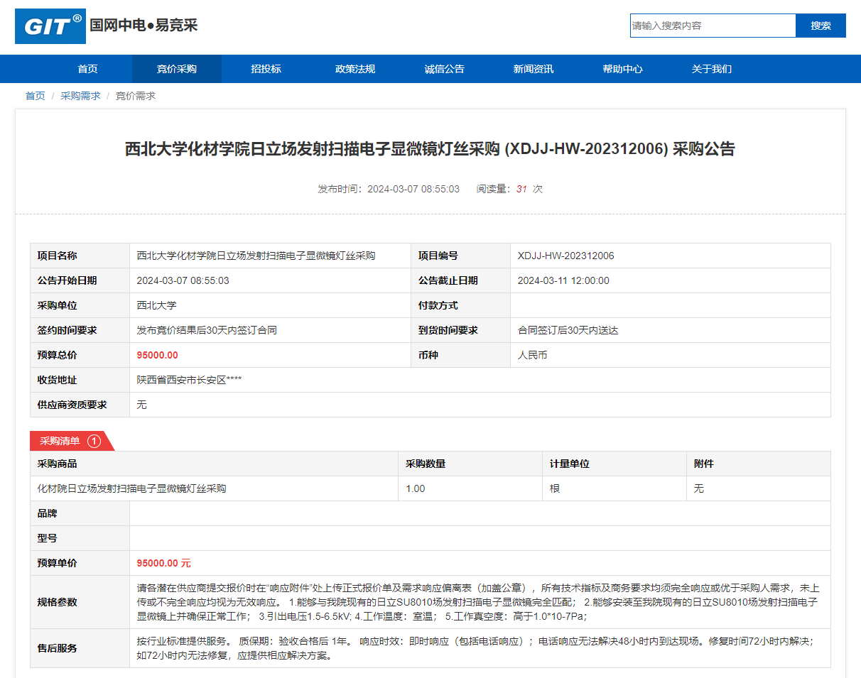广发体育化材学院日立场发射扫描电子显微镜灯丝采购 (XDJJ-HW-202312006)竞价公告 作者: 编辑: 时间:2024-03-07 原公告链接:https://www.ejingcai.com.cn/site/bidding/detail/8741