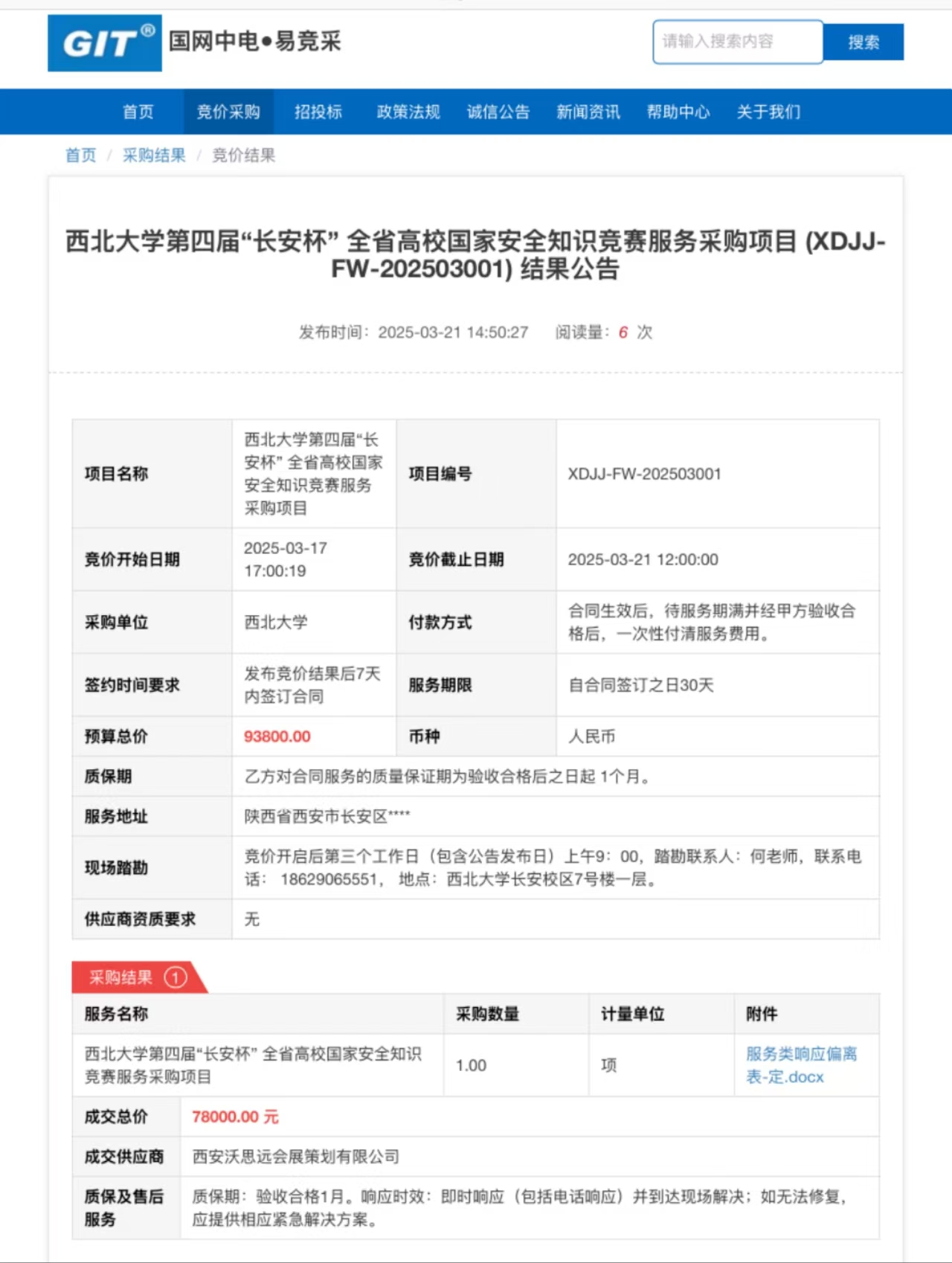 广发体育第四届“长安杯” 全省高校国家安全知识竞赛服务采购项目 (XDJJ-FW-202503001) 竞价结果公告 作者: 编辑:党丹珩 时间:2025-03-21 原链接地址:https://www.ejingcai.com.cn/site/bidding/detail/17086