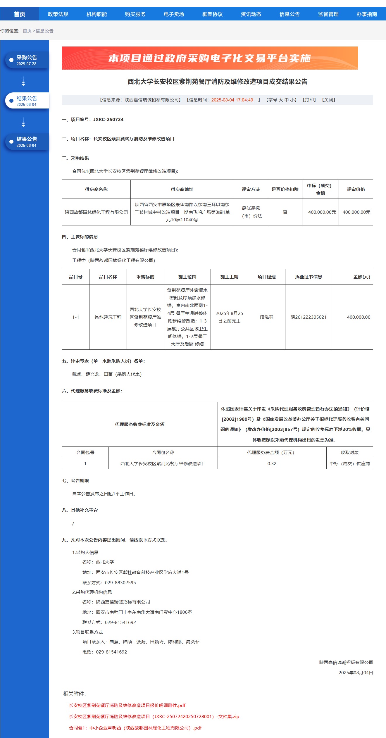 广发体育长安校区紫荆苑餐厅消防及维修改造项目成交结果公告 作者: 编辑:党丹珩 时间:2025-08-04 公告地址:http://www.ccgp-shaanxi.gov.cn/freecms/site/shaanxi/ggxx/info/2025/8a69c4d59860f6420198744983276ed2.html?noticeType=001023¬iceId=1f58d820-7114-11f0-8063-08c0eb20c666
