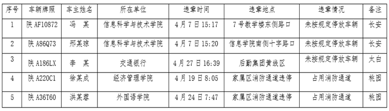 2023年4月份校园交通违章曝光 作者: 编辑: 时间:2023-05-10 为加强校内道路交通管理,规范校内交通秩序,根据《广发体育校园道路交通管理办法》的通知要求,现将2023年4月校园交通违章车辆曝光如下。 希望广大师生员工遵守校园道路交通管理办法,维护校园交通安全,共同营造良好的校园交通秩序。 广发体育道路交通安全委员会 2023年5月10日