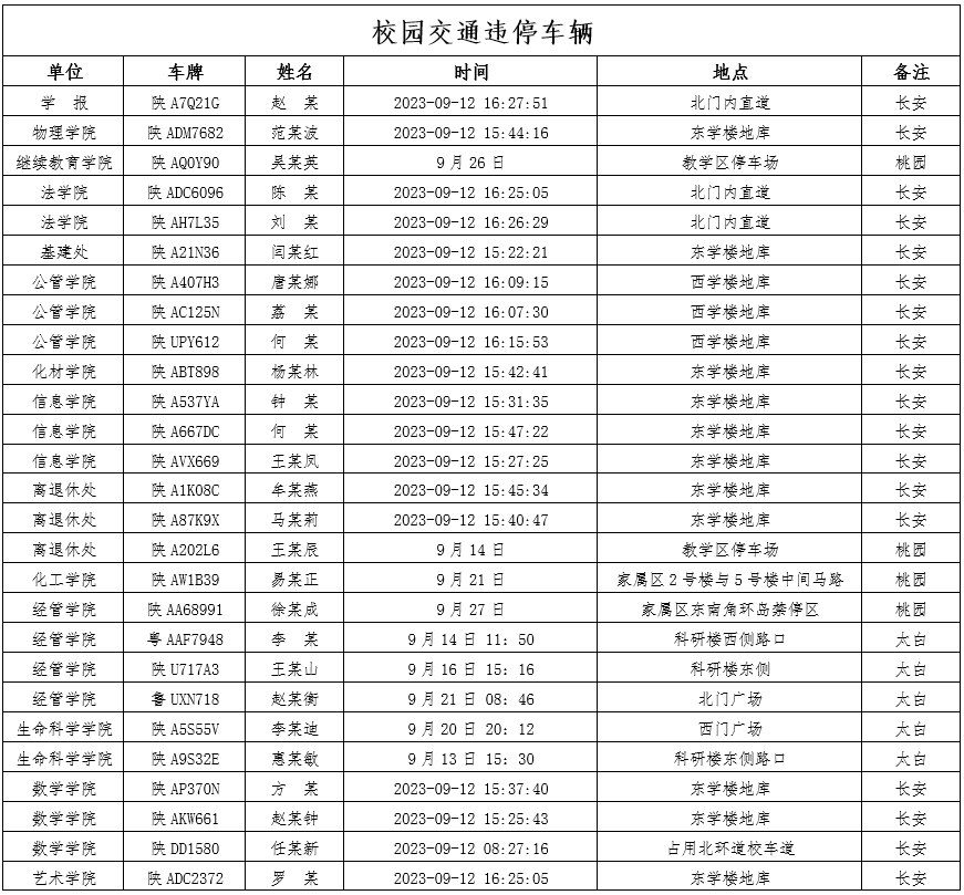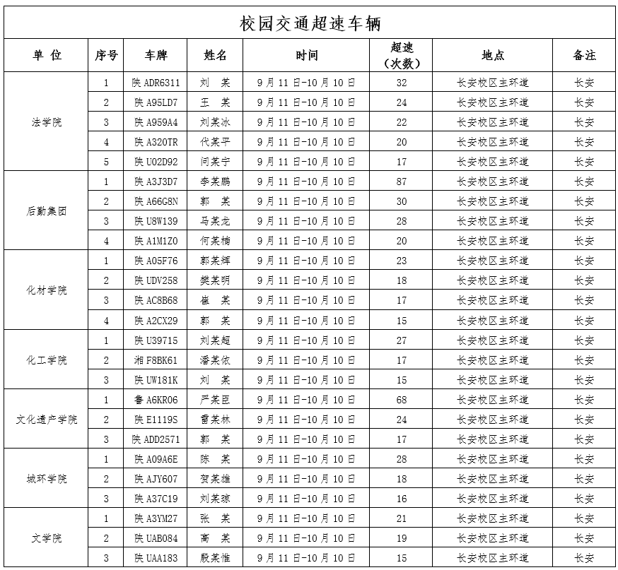 近期,省内部分高校因校内机动车行驶速度过快引发多起交通事故,造成师生员工人身、财产安全损失,教训极为深刻。为加强校内道路交通管理,规范校内交通秩序,根据《广发体育校园道路交通管理办法》的通知要求,现将2023年9月11日至10月10日校园交通屡次违章车辆予以曝光,学校道路交通安全委员会决定,对多次违章车辆即日起禁止进入校园,并将违章车辆车主信息通报到所在单位,所在单位负责对师生进行交通安全教育和日常管理。