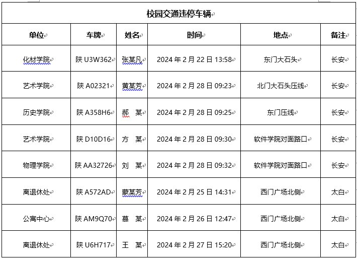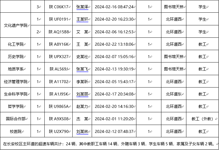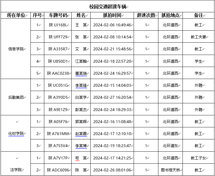 为加强校内道路交通安全管理,规范校内交通秩序,根据《广发体育校园道路交通管理办法》有关要求,现将2024年2月校园交通违章车辆予以曝光,所在单位负责对本单位违章师生员工进行交通安全教育和日常管理。