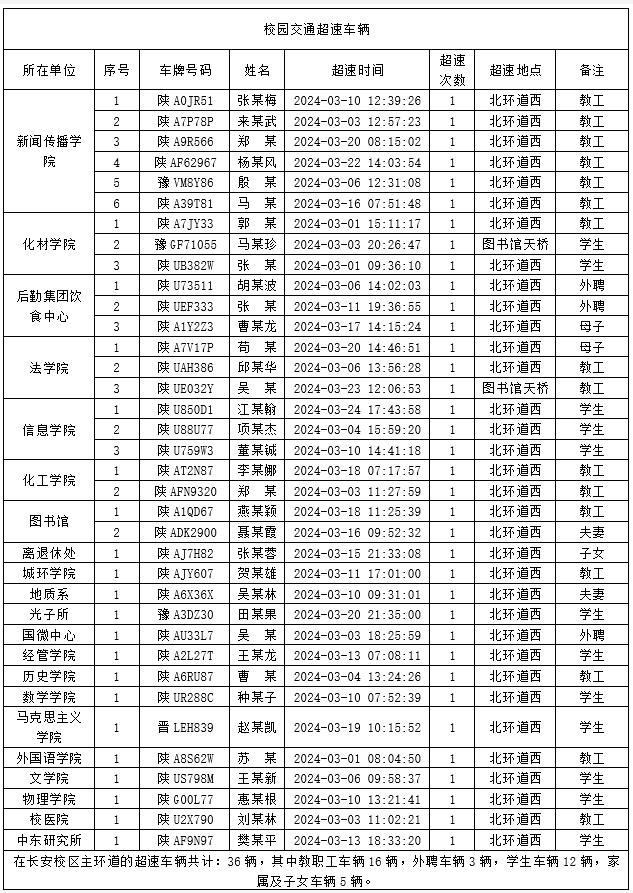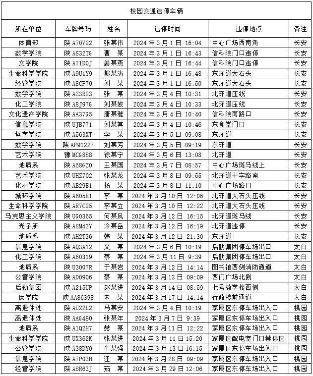 为加强校内道路交通安全管理,规范校内交通秩序,根据《广发体育校园道路交通管理办法》有关要求,现将2024年3月校园交通违章车辆予以曝光,所在单位负责对本单位违章师生员工进行交通安全教育和日常管理。