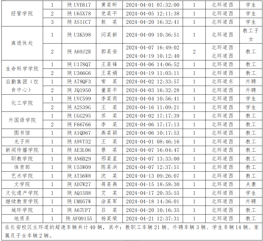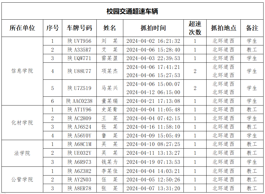 为加强校内道路交通安全管理,规范校内交通秩序,根据《广发体育校园道路交通管理办法》有关要求,现将2024年4月校园交通违章车辆予以曝光,4月份教工超速车辆占52%、学生超速车辆占35%、外聘职工及教工家属车辆占12%,请所在单位加强对本单位违章师生员工的教育和管理,对于校内曝光超速的学生车辆将取消下一年度的通行证办理资格。