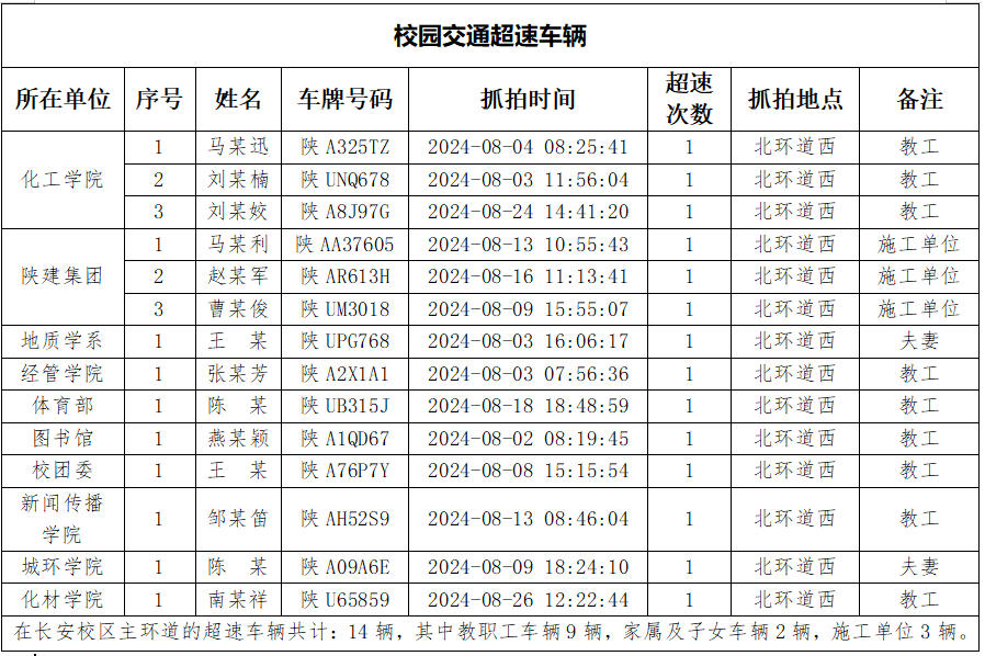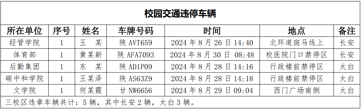 为一步加强校园交通管理,保障校园交通安全有序,维护学校正常的教学、科研和生活秩序以及师生员工的人身财产安全,根据《广发体育校园交通安全管理规定》有关要求, 现将2024年8月校园交通违章车辆予以曝光,具体情况如下表。