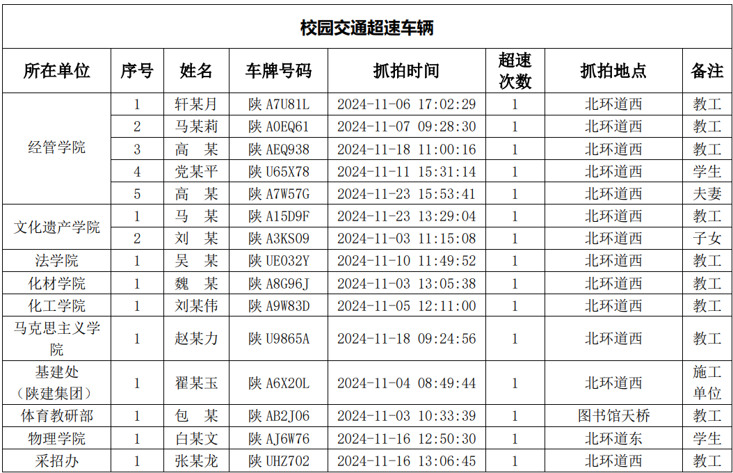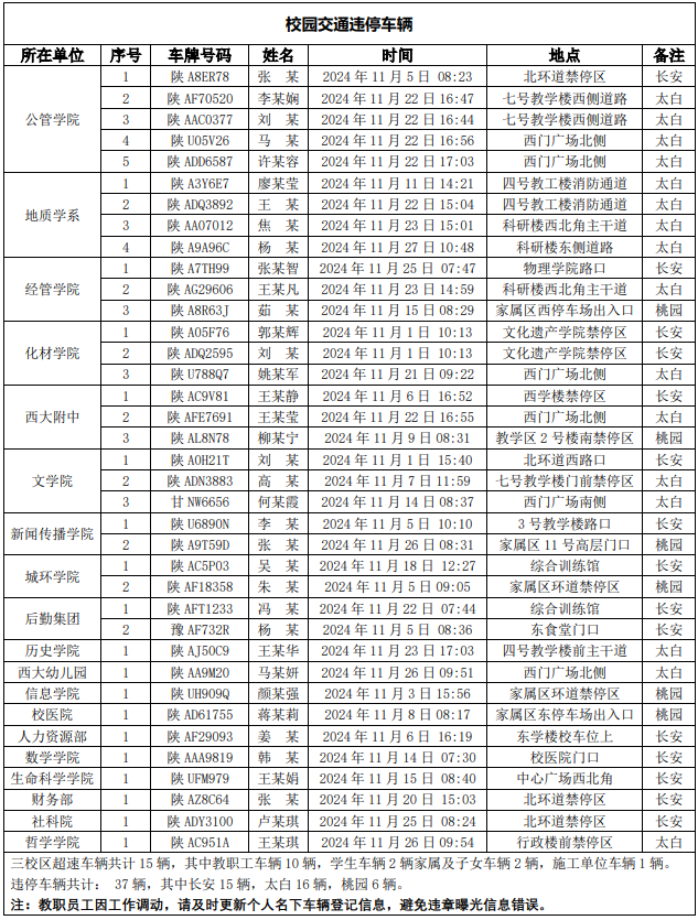 为进一步加强校园交通管理,保障校园交通安全有序,维护学校正常的教学、科研和生活秩序以及师生员工的人身财产安全,根据《广发体育校园交通安全管理规定》有关要求, 现将2024年11月校园交通违章车辆予以曝光,具体情况如下表。