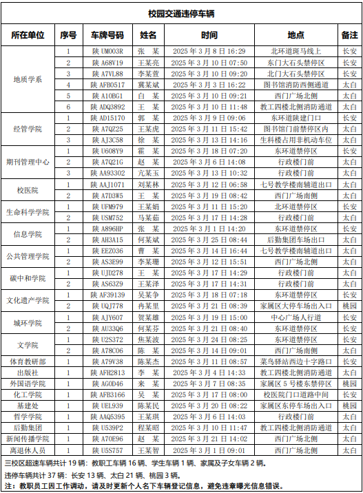 为进一步加强校园交通管理,保障校园交通安全有序,维护学校正常的教学、科研和生活秩序,切实保护师生员工的人身财产安全,根据《广发体育校园交通安全管理规定》的相关要求,现将2025年3月校园交通违章车辆予以曝光,具体要求与违章信息如下:
