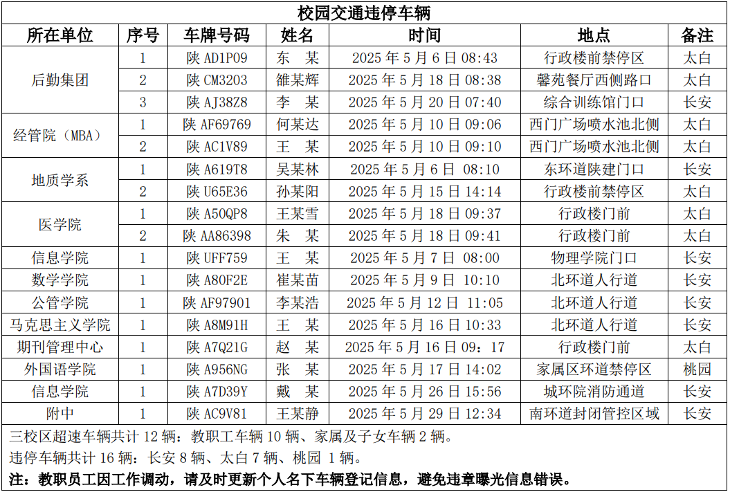 为进一步加强校园交通管理,保障校园交通安全有序,维护学校正常的教学、科研和生活秩序,切实保护师生员工的人身财产安全,根据《广发体育校园交通安全管理规定》的相关要求,现将2025年5月校园交通违章车辆予以曝光,具体要求与违章信息如下: