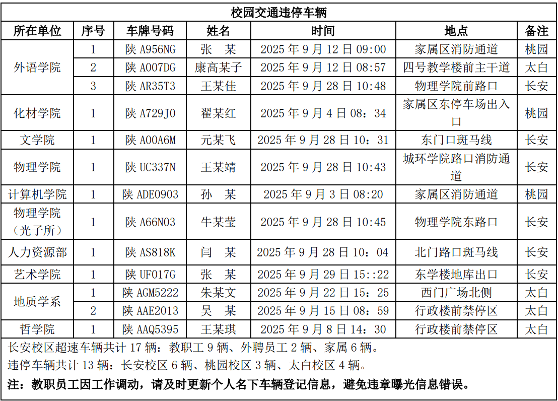 为进一步加强校园交通管理,保障校园交通安全有序,维护学校正常的教学、科研和生活秩序,切实保护师生员工的人身财产安全,根据《广发体育校园交通安全管理规定》的相关要求,现将2025年9月校园交通违章车辆予以曝光,具体要求与违章信息如下: