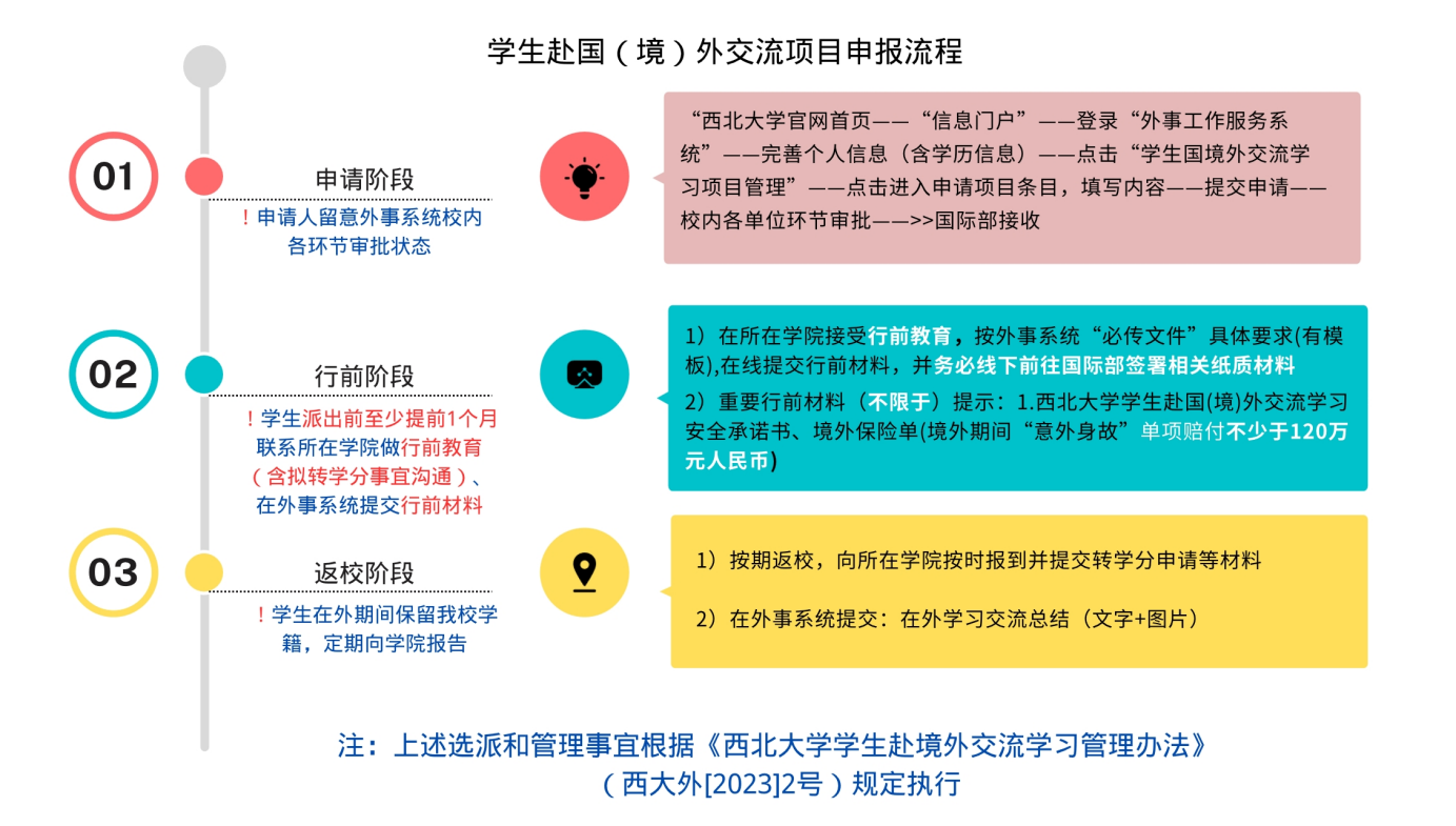 3.申请学生在确定被录取后,如确认参加本项目线下赴国境外交流模块,应及时履行出国(境)前相关行前手续。具体流程及要求见下图。
