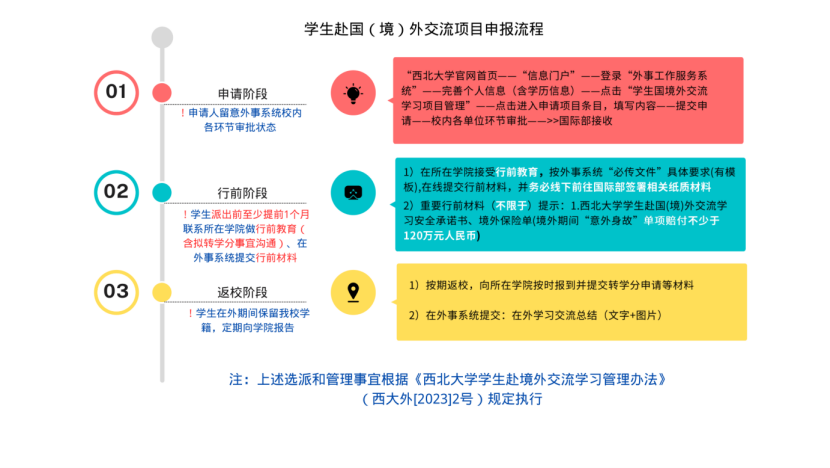 3. 申请学生在确定录取后,应及时履行出国(境)前相关行前手续。请务必了解有关本项目学生的申请、行前、返校阶段情况说明,请见下图。