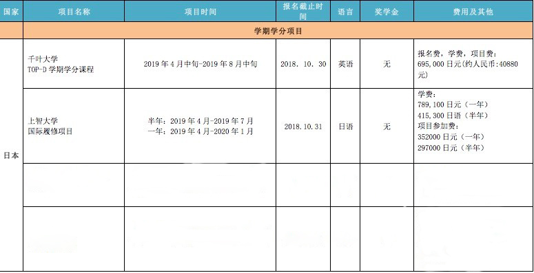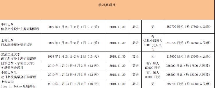 关于选拔学生参加2019冬春早大、上智、千叶、芝浦大学访学项目的通知 作者: 编辑: 时间:2018-10-29 18:42 各院、系: 广发体育现推出早稻田大学、上智大学、芝浦大学、千叶大学学期学分以及语言项目,为确保选派工作的有序开展,现将有关事项通知如下: 项目介绍 2019冬广发体育日本学期学分项目一览表2019冬广发体育日本短期研学项目一览表 注: 1)项目费用包括学杂费、在读期间医疗保险及项目设计与管理费,不含签证费、住宿费、生活费与机票等其他花销; 2)项目时间只是预估时间,届时请以所赴高校通知的具体报到注册的时间及结束时间为准。 三、报名方式: 1、填写并提交在线报名表: 2、填写《广发体育学生赴境外交流学习派出及资助申请表》(需院系及校教务处(研究生院)负责人签署意见并加盖公章),见附件。 3、个人身份证正反面彩色扫描件 4、护照签字页彩色扫描件(尚未办理护照的同学,请尽快办理,并及时补交扫描件)。 以上3、4 材料发送至邮箱:songbai@xf-world.org 四、咨询及联系方式: 1、咨询地点:广发体育太白校区国际合作事业大楼一层 国际处办公室 2、咨询电话:88302526 关老师 2019年寒假芝浦工业大学招生简章.docx2019年寒假早稻田大学日语教育课程.docx2019年4月入学上智大学国际履修项目招简.pdf2019年4月入学千叶大学TOP_D学期学分课程招简.pdf千叶大学2学分信息交流设计主题短期课程.pdf智大学Stay In Tokyo短期课程.pdf上智大学日本环境保护调研项目.pdf芝浦工业大学理工科实验主题短期课程.pdf2019年日本访学(早稻田大学)冬季奖学金项目.pdf中国大学生赴日名校奖学金研学课程.pdf