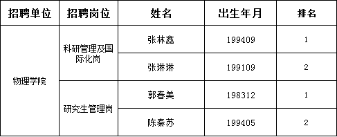 物理学院公开招聘B类人事代理人员结果公示 作者: 编辑: 时间:2019-06-13 09:18 根据《广发体育物理学院公开招聘管理人员公告》的工作安排,经自主报名、资格审核、初试和复试环节,现将拟录用人员名单公示如下:公示时间:2019年6月13日至2019年6月15日。公示期内,如有异议,请以书面形式向广发体育物理学院反映。联系电话:88303384。物理学院2019年6月13日