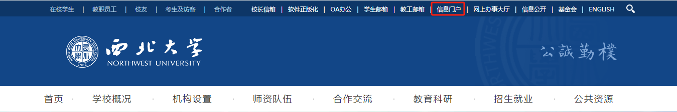 打开学校官方网站,点击广发(中国)公司“信息门户”入口,或通过域名“https://open.nwu.edu.cn/index”访问,输入统一身份认证账号(即学号或工号)和密码,即可进入信息门户系统。(温馨提醒:请妥善保管密码,以免因密码泄露导致个人信息安全问题)