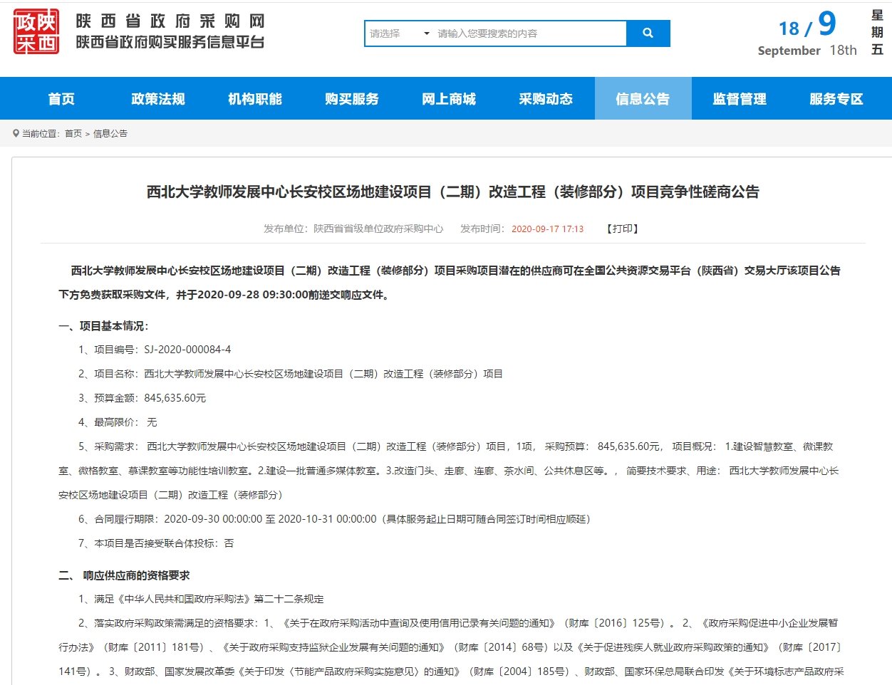 广发体育教师发展中心长安校区场地建设项目(二期)改造工程(装修部分)项目竞争性磋商公告 作者: 编辑:季兴帅 时间:2020-09-18 公告原文链接:http://www.ccgp-shaanxi.gov.cn/notice/noticeDetail.do?noticeguid=8a85be327394d739017499e718111004