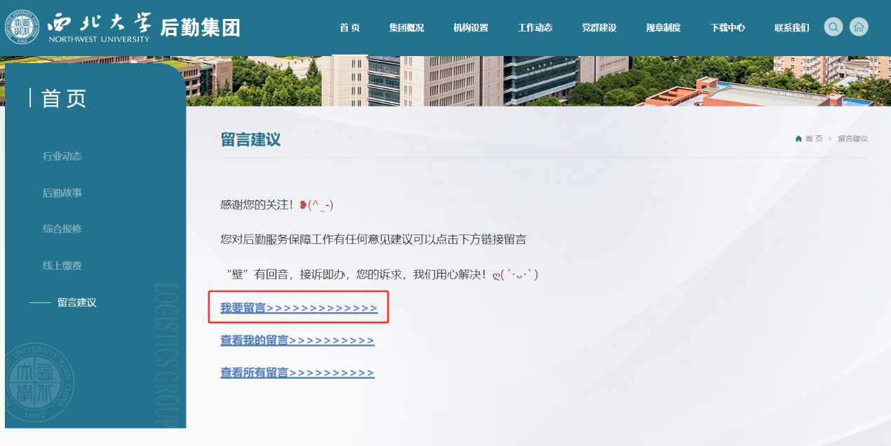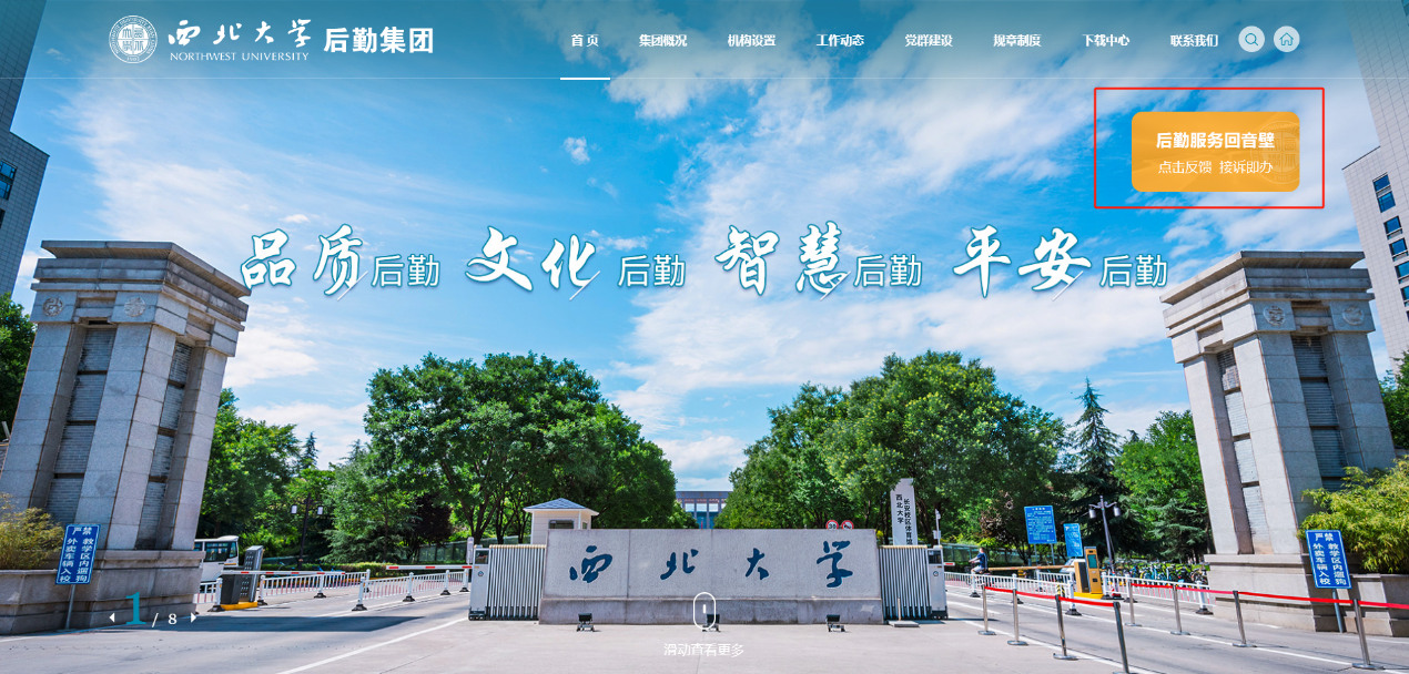 1.通过PC端或手机端,进入学校官网,下滑至网页末端,点击“后勤服务”,进入后勤集团官方网站(https://hqjt.nwu.edu.cn/);