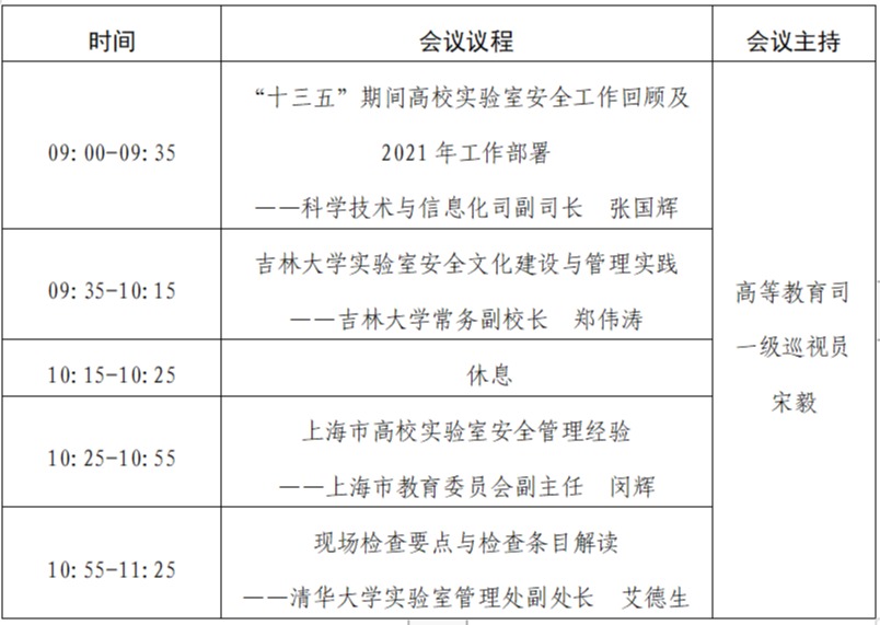 根据《教育部办公厅关于组织开展2021年度高等学校实验室安全检查工作的通知》(教发厅函<2021>9号)、《教育部科学技术与信息化司、高等教育司关于组织召开2021年高校实验室安全现场检查启动暨工作交流会的通知》(教科信司<2021>89号)的文件精神,为进一步加强学校实验室安全管理,提升实验室人员的专业安全防范知识和科学规范的管理和处置技能,树牢实验室安全发展理念,筑牢实验室安全防线,现就在线参加高校实验室安全现场检查启动暨工作交流会有关事项通知如下: