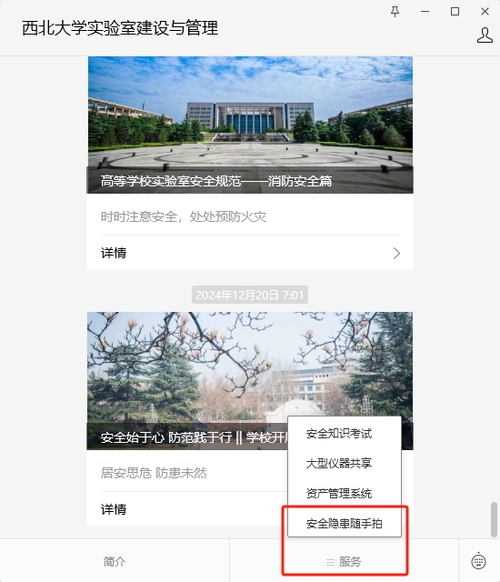 (1)关注“广发体育实验室建设与管理”微信公众号,选择“服务”—“安全隐患随手拍”,填写个人信息、隐患描述等,并上传隐患照片。