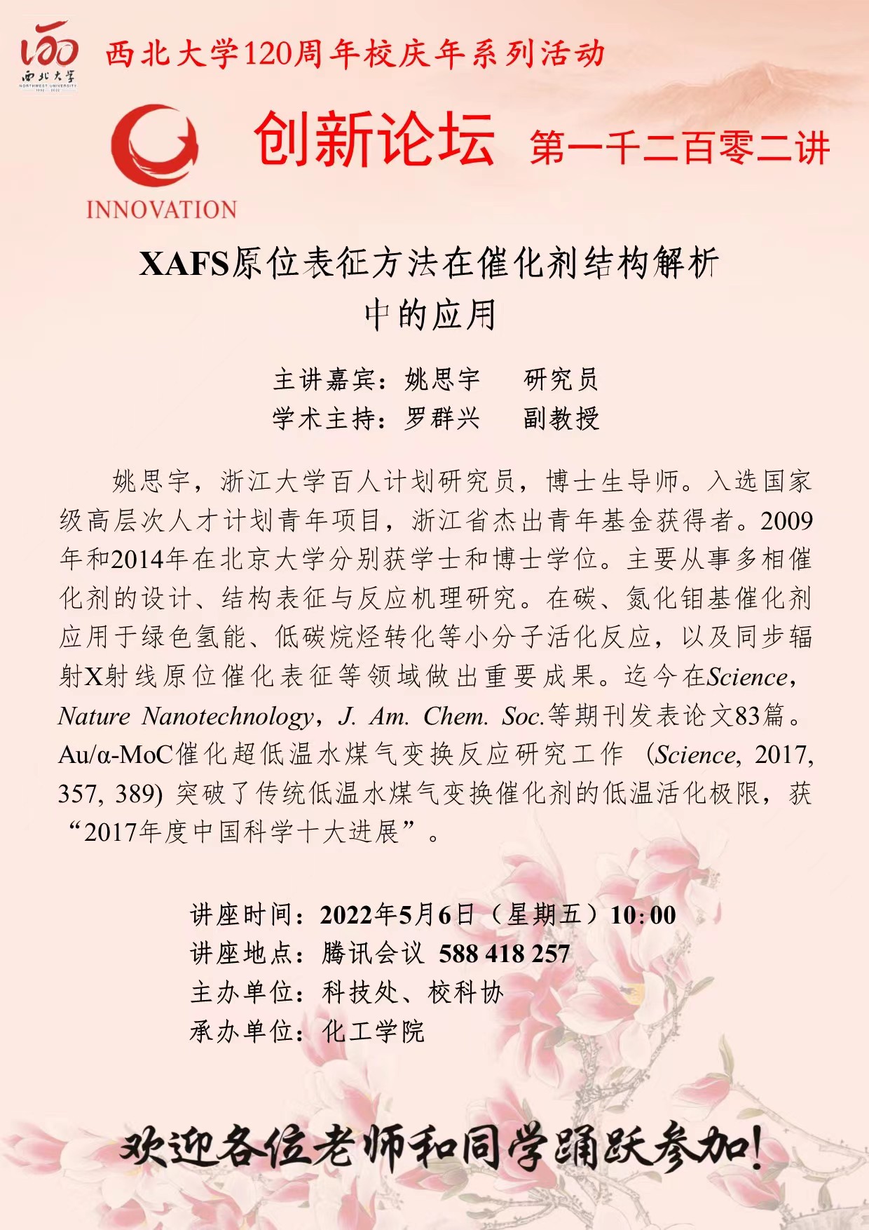 广发体育创新论坛第一千二百零二讲暨120周年校庆年系列活动:XAFS原位表征方法在催化剂结构解析中的应用