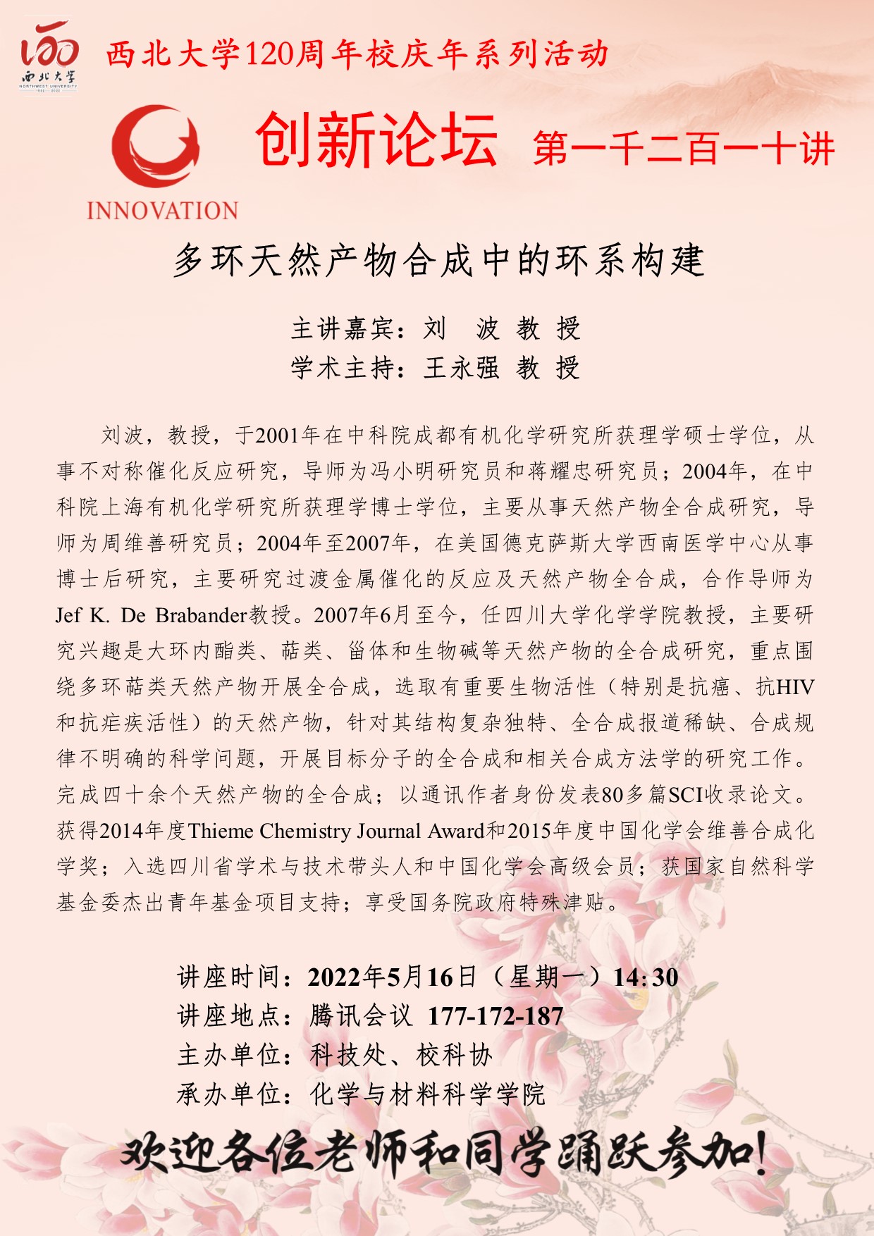 广发体育创新论坛第一千二百一十讲暨120周年校庆年系列活动:多环天然产物合成中的环系构建