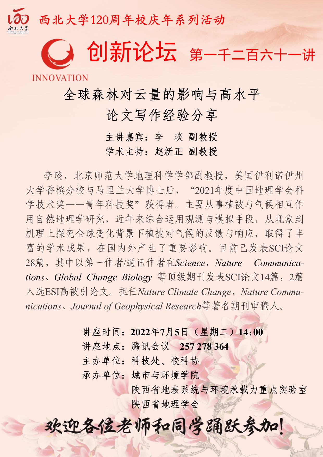 广发体育创新论坛第一千二百六十一讲暨120周年校庆年系列活动:全球森林对云量的影响与高水平论文写作经验分享