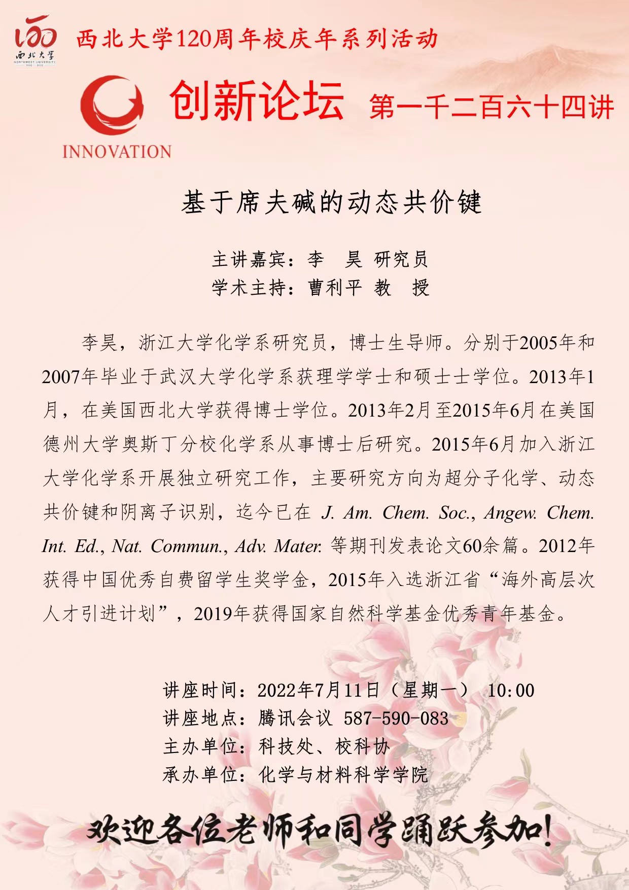 广发体育创新论坛第一千二百六十四讲暨120周年校庆年系列活动:基于席夫碱的动态共价键