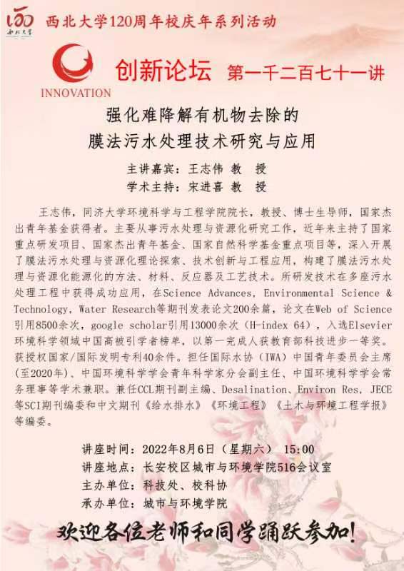 广发体育创新论坛第一千二百七十一讲暨120周年校庆年系列活动:强化难降解有机物去除的膜法污水处理技术研究与应用