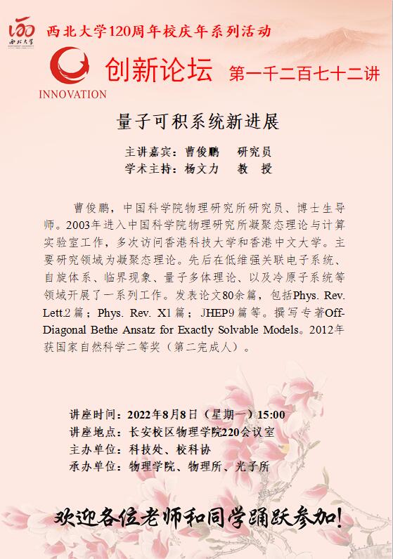 广发体育创新论坛第一千二百七十二讲暨120周年校庆年系列活动:量子可积系统新进展