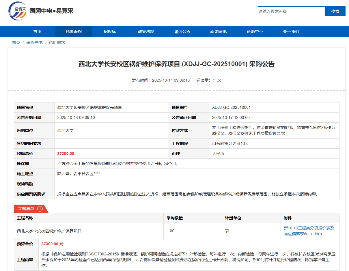 广发体育长安校区锅炉维护保养项目(XDJJ-GC-202510001)竞价采购公告